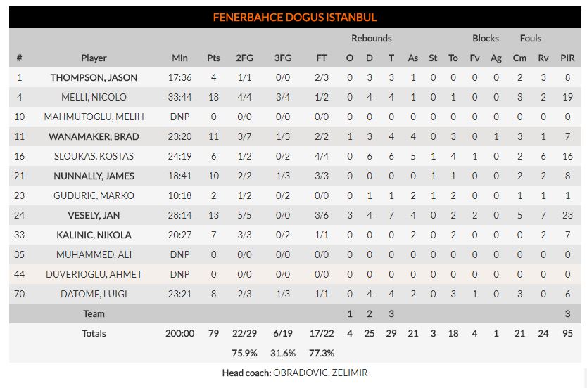 Από τη Φενέρ ξεχώρισε ο Νικολο Μέλι με 18 πόντους, ενώ ο Κώστας Σλούκας είχε σε 24 λεπτά συμμετοχής 6 πόντους, 6 ριμπάουντ, 5 ασίστ και 1 κλέψιμο.