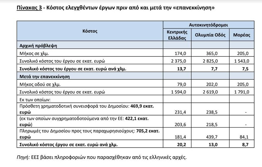 Σε ό,τι αφορά ειδικά στην Ελλάδα η οποία, όπως σημειώνεται είναι μακράν ο μεγαλύτερος αποδέκτης συνεισφορών της ΕΕ, διαπιστώθηκε πως το κόστος ανά χιλιόμετρο τριών αυτοκινητόδρομων που υποβλήθηκαν σε εξέταση αυξήθηκε έως και κατά 69%, ενώ παράλληλα το αντικείμενο των έργων μειώθηκε έως και κατά 55%.