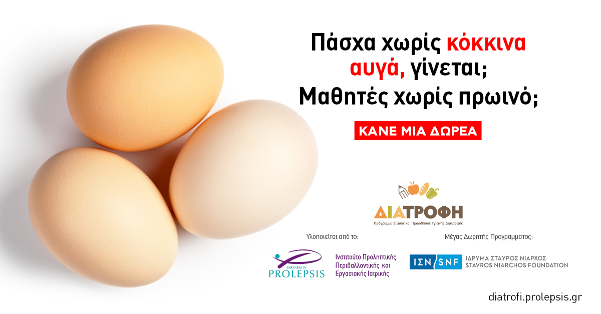 Αυτό το Πάσχα το Ινστιτούτο Prolepsis με κεντρικό σύνθημα «Πάσχα χωρίς κόκκινα αυγά, γίνεται; Μαθητές χωρίς πρωινό;» απευθύνει κάλεσμα σε όλους τους πολίτες με στόχο να εξασφαλισθεί μέσω του Προγράμματος ΔΙΑΤΡΟΦΗ η σίτιση σε 421 μαθητές έξι σχολείων, που βρίσκονται σε ευπαθείς περιοχές της Αττικής, της Θράκης και της Ημαθίας.