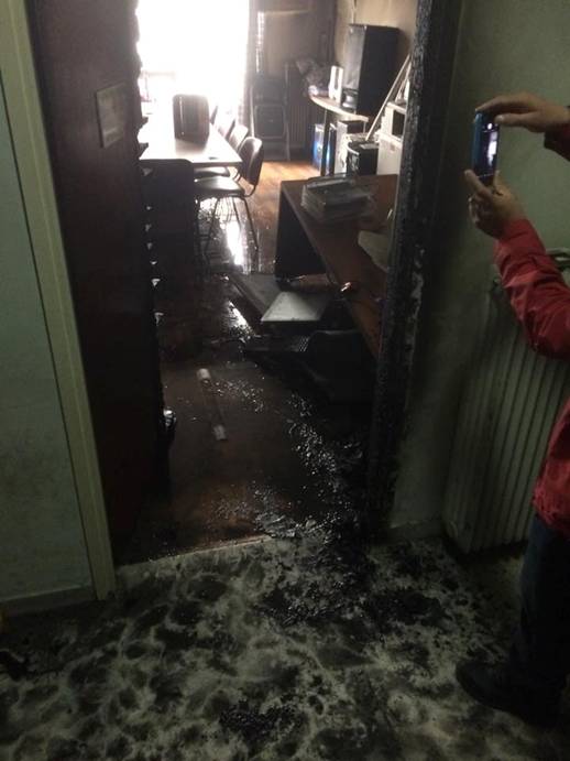 » Ο άνθρωπος που εργάζεται εκεί δεν είχε πάει ακόμη. Ο χώρος ο οποίος καταστράφηκε δεν είχε καμία διέξοδο σε περίπτωση εγκλωβισμού. Την φωτιά αντιλήφθηκε ένοικος ο οποίος την εσβησε. Οι φασίστες είχαν ρίξει εύφλεκτο υγρό στην πόρτα το οποίο διείσδυσε προκαλώντας ζημιές και στο εσωτερικό χώρο, σε κομπιούτερ, γραφεία, ηχητικά και βιβλιοθήκες.»