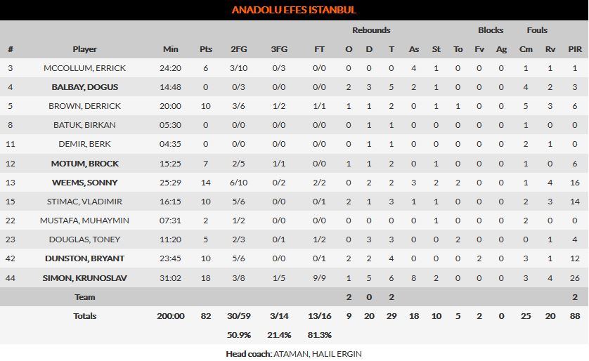 Ο Σέρβος πίβοτ «άγγιξε» το double double (20 πόντους, 8 ριμπάουντ), όντας η πιο αξιόπιστη επιθετική λύση για την ομάδα του Γιάννη Σφαιρόπουλου. Ο Γιώργος Πρίντεζης με 11 πόντους και 8 ριμπάουντ ήταν αρκετά καλός, ενώ από τους Τούρκους ξεχώρισε ο Σιμόν με 18 πόντους. Τα δεκάλεπτα: 30-15, 49-42, 70-57, 89-82