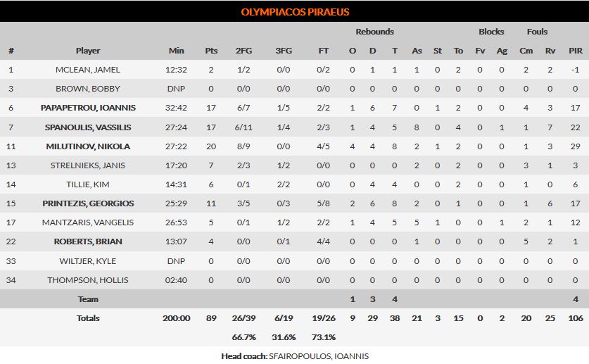 Οι Πειραιώτες «έπαιξαν με την φωτιά», αλλά ευτυχώς γι’ αυτούς είχαν σε ένα ακόμη εξαιρετικό βράδυ τον Βασίλη Σπανούλη. Με 17 πόντους ο αρχηγός οδήγησε την ομάδα του στα δύσκολα, ενώ είχε 5 ριμπάουντ και 8 ασίστ.