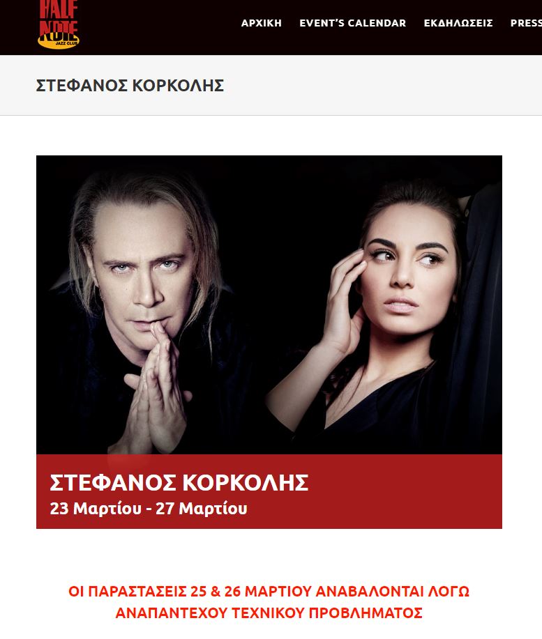 Στο site της μουσικής σκηνής ενημερώνονται οι πελάτες ότι «Οι παραστάσεις 25 & 26 Μαρτίου αναβάλλονται λόγω αναπάντεχου τεχνικού προβλήματος».