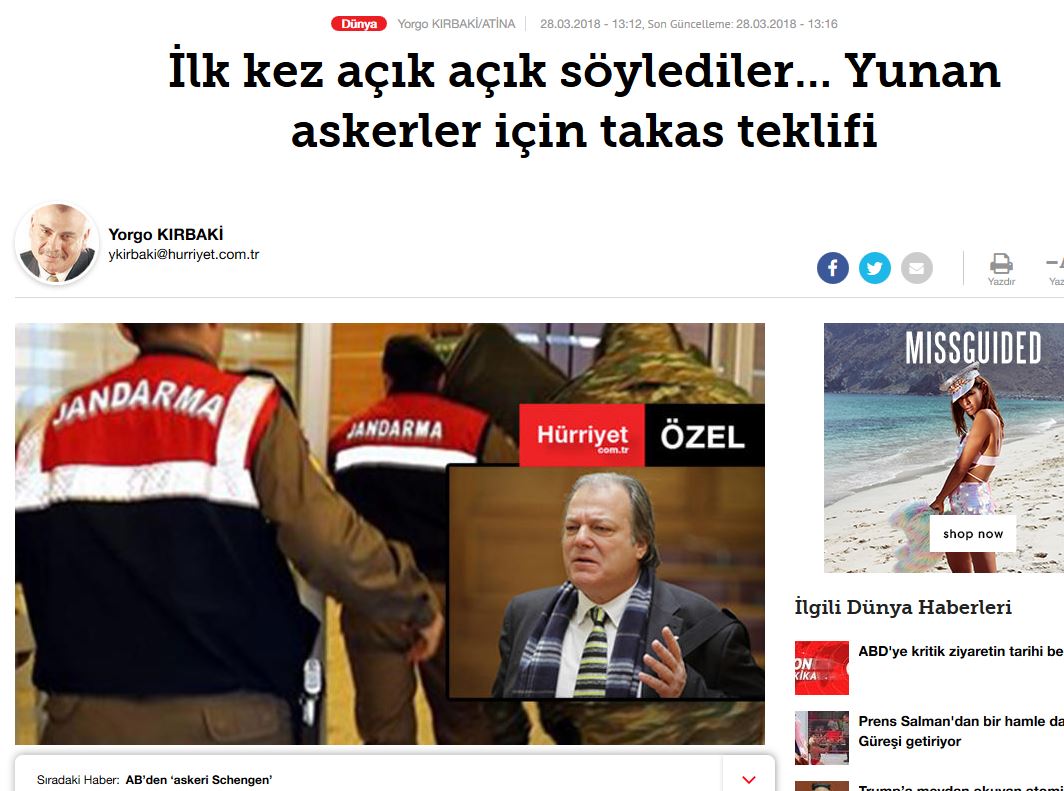 Η εφημερίδα αναφέρεται στις δηλώσεις Κατσίκη, σημειώνοντας πως ήρθαν μετά τις δηλώσεις του Ερντογάν για τους δύο στρατιωτικούς, παρουσιάζοντας με αυτό τον τρόπο την ιδέα της ανταλλαγής ως επακόλουθο των πράξεων του τούρκου προέδρου.