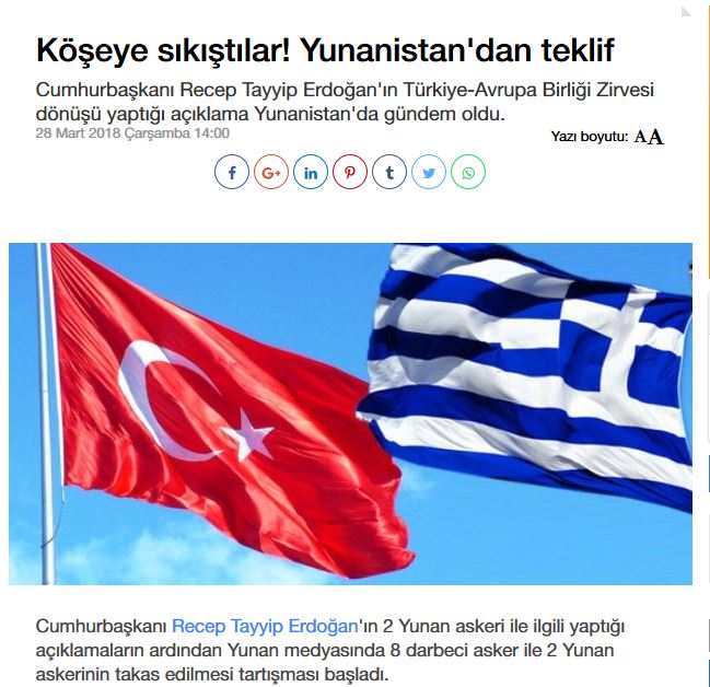 Στο ίδιο κλίμα η Haber7 με τον τίτλο: «Το είπαν για πρώτη φορά! Η προσφορά ανταλλαγής στην Τουρκία» αναφερόμενη στη θέση του κ. Κατσίκη, ο οποίος ως στέλεχος της κυβέρνησης συζήτησε την ανταλλαγή των ελλήνων στρατιωτικών με τους τούρκους αξιωματικούς.