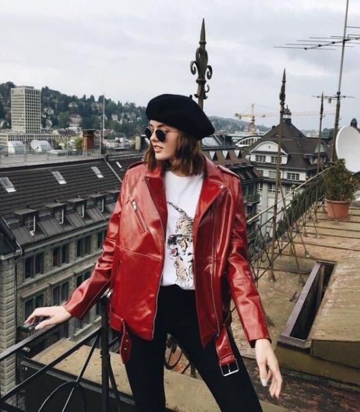 Ένα κόκκινο vinyl jacket δίνει ένα πιο ροκ χαρακτήρα στο outfit.