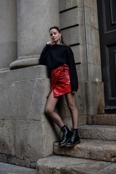 Η κόκκινη vinyl φούστα δίνει στο ντύσιμο μια άκρως θηλυκή διάθεση και αύρα.