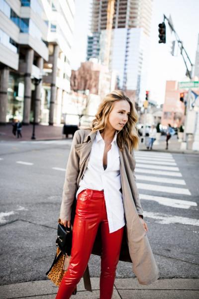 Το vinyl παντελόνι δεν έχει τίποτα να ζηλέψει από τα δερμάτινα παντελόνια που προτιμούν πολλές γυναίκες. Σε στενή γραμμή, επιλέξτε το ίδιο χρώμα σε ολόκληρο το look.