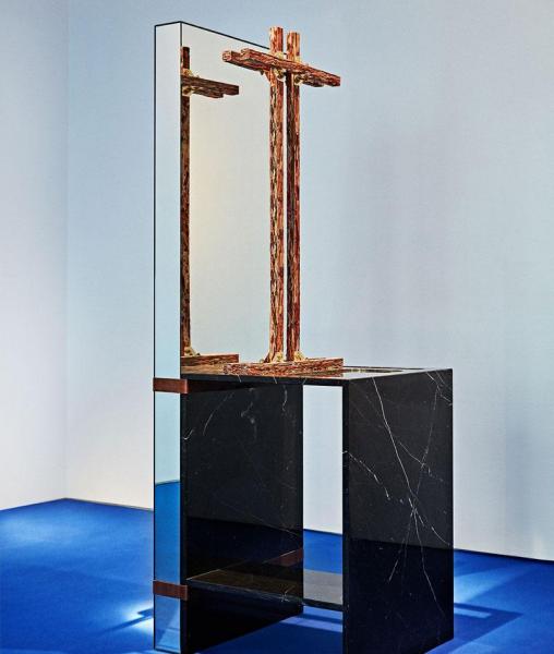 Ο Ισπανός σχεδιαστής συμπιέζει και κόβει βαμμένα δερμάτινα αποκόμματα σε μακρά προφίλ με κόκκο όπως μάρμαρο ή ξύλο. Το «Poli-Piel», μια ατομική παράσταση στη γκαλερί της Μαδρίτης Machado-Muñoz, δείχνει ότι οδηγεί την εφεύρεσή του σε μια «τολμηρή» κατεύθυνση. Το δέρμα είναι το κοινό στοιχείο σε οκτώ ξεχωριστά κομμάτια επίπλων και φωτισμού. οι πόρπες και οι δερμάτινες λουρίδες συνδυάζουν το δικό του υλικό με τα γυάλινα, αλουμινένια και τους καθρέφτες. Σηματοδοτώντας την πρώτη ατομική έκθεση του Penadés, το «Poli-Piel» προβάλλει επίσης μια νέα τεχνική που έχει βρει ο καλλιτέχνης για να συνεισφέρει το φυσικό υλικό σε δομική μορφή.
