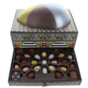 Ένα σεντούκι θησαυρού γεμάτο με σοκολατένια καλούδια. Ένα αυγό διαθέσιμο είτε με σοκολάτα γάλακτος είτε με μαύρη σοκολάτα είναι τοποθετημένο στην κορυφή του κουτιού με γεωμετρικά σχέδια να το στολίζουν. Στο συρτάρι του κουτιού υπάρχουν μικρές σοκολατένιες μπουκιές από μικρά αυγά και ένα ασημένιο μαργαριτάρι στο κέντρο.
