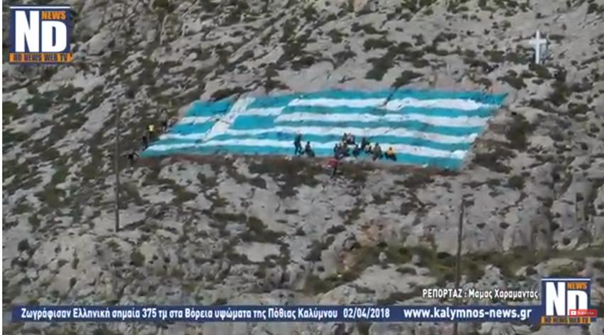 Μια γιγαντιαία Ελληνική σημαία 375 τμ (15Χ25) ,ζωγράφισαν την Μεγάλη Δευτέρα κάτοικοι της Καλύμνου στα βόρεια υψώματα του νησιού.