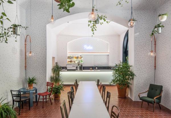 Λευκοί τοίχοι με πουά λεπτομέρειες, γυάλινες λάμπες με ροζ χρυσές βάσεις και καταπράσινα φυτά σε όλο το χώρο δημιουργούν το κατάλληλο και χαλαρό κλίμα που χρειάζεται ο επισκέπτης για απολαύσει τις γλυκές πανδαισίες που μπορεί να του προσφέρει.