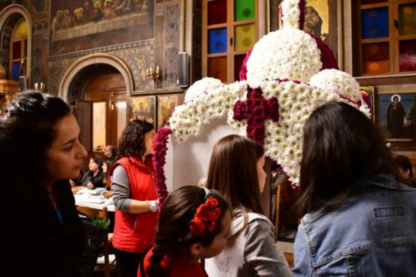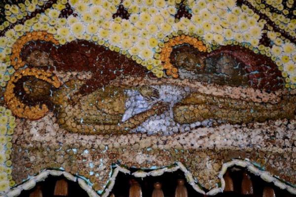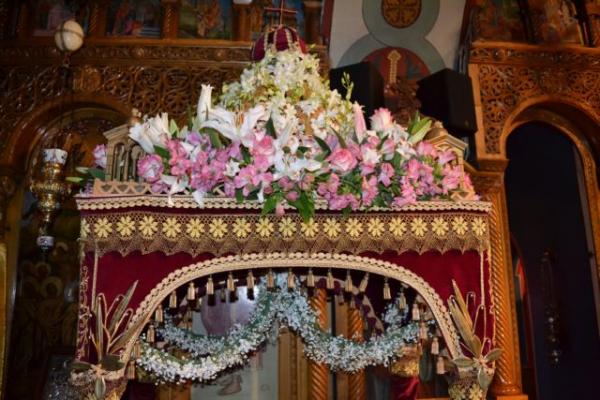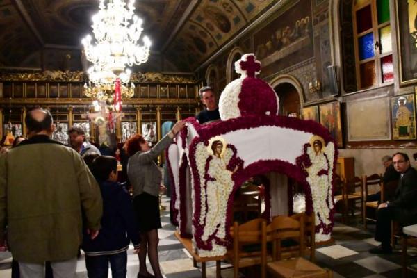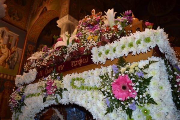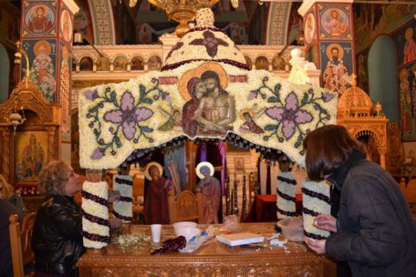 Τρείς μήνες χρειάστηκαν για να ετοιμαστεί ο Επιτάφιος της Αγίας Τριάδος στην Πρόνοια Ναυπλίου. Μικρά κορίτσια και γυναίκες αλλά και άνδρες της ενορίας μέχρι αργά το βράδυ της Μεγάλης Πέμπτης ολοκλήρωσαν τον στολισμό. Χιλιάδες άσπρα και μοβ χρυσάνθεμα χρειάστηκαν για να ολοκληρωθεί το σχήμα του Επιταφίου, που εμπλουτίστηκε για την τελική μορφή του και με πάρα πολλά στρας.