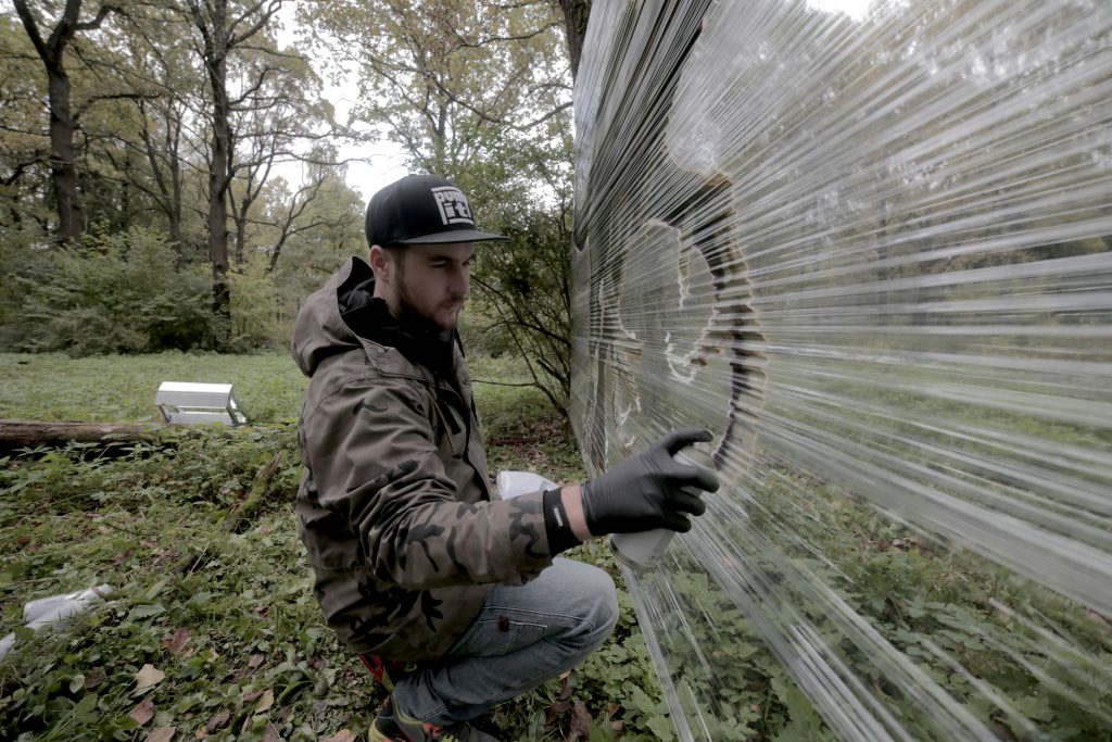 Αντικατέστησε λοιπόν, τις δημόσιες επιφάνειες με μια πλαστική μεμβράνη. Τεντώνοντας τη μεμβράνη γύρω από δέντρα ή κολώνες, δημιουργεί ένα νέο, διαφορετικό και ιδιαίτερο καμβά που δε συναντά κανείς συχνά γύρω του. Έτσι, θέλησε να θέσει ως πρωταγωνιστές των έργων του ζώα, τα οποία ζωντανεύουν μέσω των σχεδίων του στο φυσικό τους περιβάλλον.