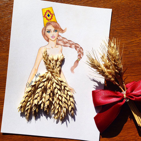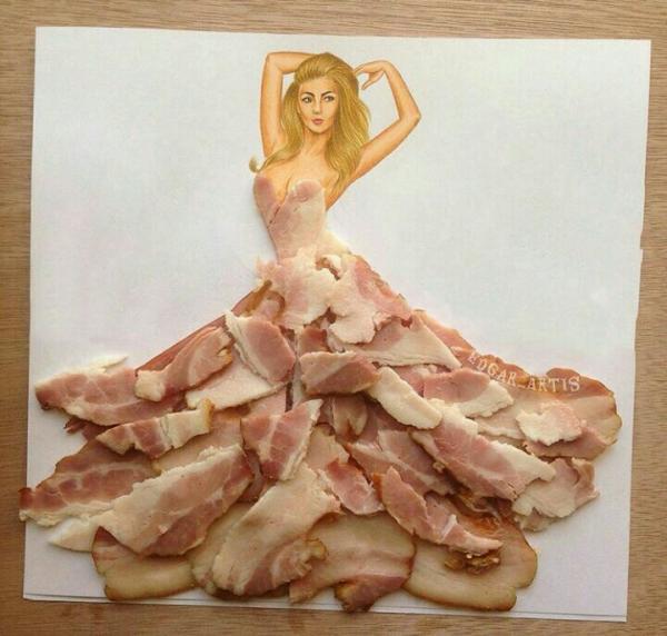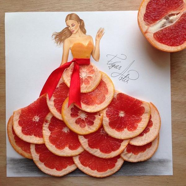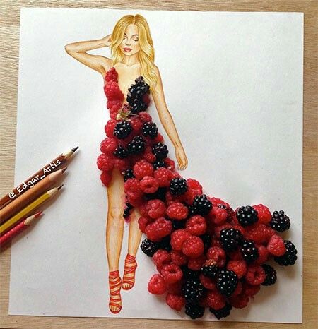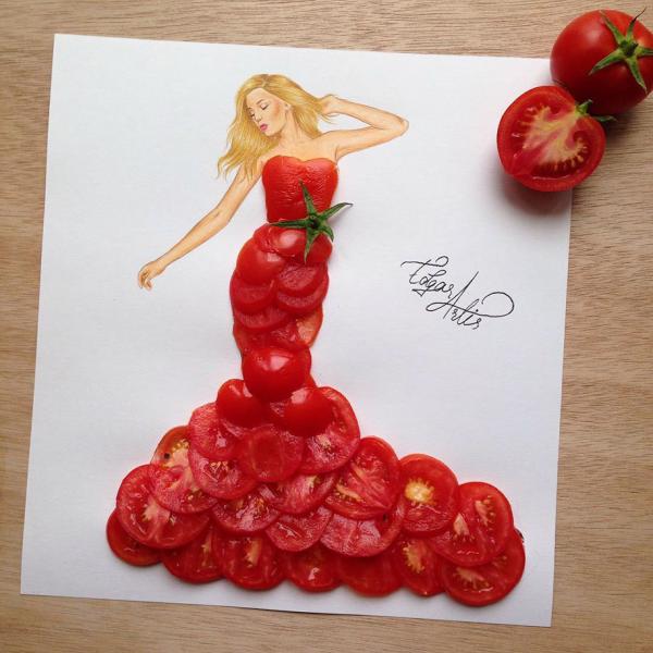 Το ιδιαίτερο στοιχείο σε αυτά τα σκίτσα είναι ότι ολόκληρη η επιφάνεια των ρούχων των γυναικών δεν είναι γεμισμένα με χρώμα, αλλά με είδη τροφίμων.