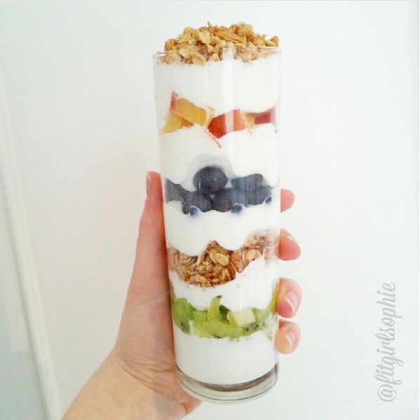 Χρησιμοποιήστε μεγάλα ποτήρια και βάλτε μέσα στρώσεις από γιαούρτι, φρούτα και δημητριακά, όλα όσα πρέπει να έχει ένα καλό πρωινό για να ξεκινήσει κάποιος με ενέργεια την μέρα του.
