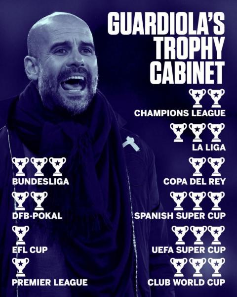 Συνολικός απολογισμός του Πεπ Γκουαρντιόλα στην Μπαρτσελόνα: Τρία πρωταθλήματα, δύο Κύπελλα, τρία ισπανικά Σούπερ Καπ, τρία Σούπερ Καπ Ευρώπης, τρία Παγκόσμια Κύπελλα Συλλόγων, δύο Τσάμπιονς Λιγκ.