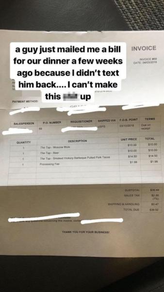 Ο λόγος για την Αμάντα Μπάρνετ, η οποία λίγες εβδομάδες μετά το πρώτο ραντεβού και αφού απέφευγε τον άντρα με τον οποίο είχαν βγει, δέχτηκε ένα μέιλ που την ενημέρωνε ότι πρέπει να πληρώσει τα μισά από τον συνολικό λογαριασμό που είχε πληρώσει εκείνος, δρώντας ως τζέντλεμαν στο πρώτο τους ραντεβού.