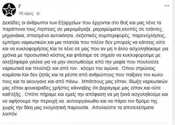 «Δεκάδες οι άνθρωποι των Εξαρχείων που έρχονται στο Βοξ και μας λένε τα παράπονα τους. Ληστείες σε μικρομάγαζα, μαχαιρώματα, κλοπές σε τσάντες, μηχανάκια, σπασμένα αυτοκίνητα, σεξιστικές συμπεριφορές, παρενοχλήσεις, εμπόριο ναρκωτικών, και μια πλατεία που πλέον δεν μπορείς να κάτσεις ούτε και να κυκλοφορήσεις.