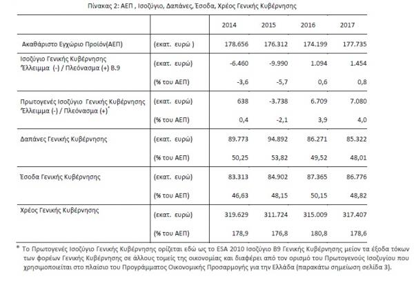 Το πλεόνασμα της Γενικής Κυβέρνησης για το έτος 2017, σύμφωνα με τον κανονισμό ESA 2010 (ο οποίος παρουσιάζει μικρές διαφορές από τη μεθοδολογία του Προγράμματος Οικονομικής Προσαρμογής), εκτιμάται στα 1,5 δισ. ευρώ (0,8% επί του Ακαθάριστου Εγχώριου Προϊόντος).