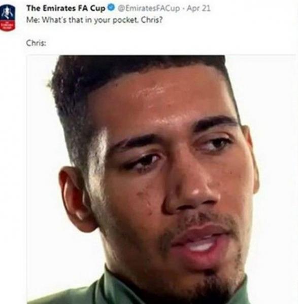 Συγκεκριμένα, ανέβηκε ένα tweet από τον επίσημο λογαριασμό της αγγλικής ομοσπονδίας ποδοσφαίρου στο οποίο υπήρχε η ερώτηση «Κρις τι έχεις στην τσέπη σου;» μαζί με βίντεο του Σμόλινγκ που λέει «Χάρι Κέιν».