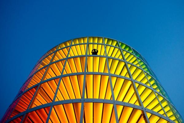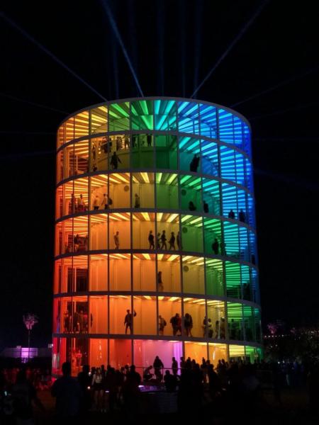 Γι’ αυτό το λόγο κατασκευάστηκε το Spectra, από το γραφείο NEWSUBSTANCE. Πρόκειται για ένα κυκλικό κτίριο των 360 μοιρών, το οποίο περιτριγυρίζουν 31 χρωματιστά πάνελ που θυμίζουν ουράνιο τόξο, ενώ το βράδυ φωτίζεται από 6.000 led φώτα.
