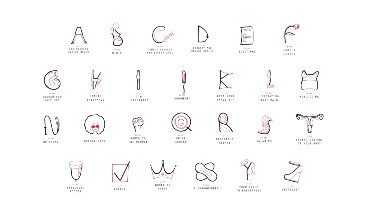 Κάθε γράμμα είναι σχεδιασμένο έτσι ώστε να κεντρίζει την προσοχή γύρω από την ανισότητα ή και σοβαρά ζητήματα υγείας για τα οποία δε πρέπει να αδιαφορεί καμία γυναίκα.