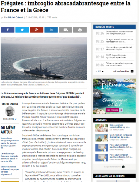 Σύμφωνα με το δημοσίευμα, η παραχώρηση των δύο φρεγατών στην Ελλάδα θα μείωνε την επιχειρησιακή επάρκεια του γαλλικού Πολεμικού Ναυτικού.
