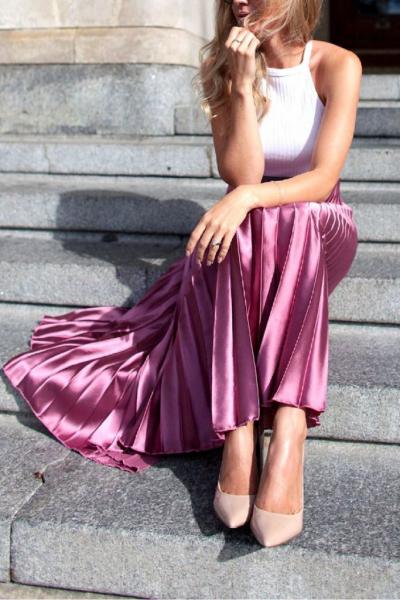 Η άνοιξη ξυπνά στις γυναίκες μια πιο κοριτσίστικη και παιχνιδιάρικη διάθεση, γι’ αυτό και έφτασε η ώρα να εκμεταλλευτείς τη σατέν φούστα σου. Μια αέρινη πλισέ φούστα είναι μια κομψή και άκρως γυναικεία επιλογή. Τόλμησε ένα ζωντανό χρώμα στη φούστα σου για να αναδείξει καλύτερα και το σατέν στοιχείο. Συνδύασε το με ένα ήσυχο λευκό τοπάκι και ένα ζευγάρι λευκά sneakers αν θες να κάνεις μια πιο street style εμφάνιση, αλλιώς τίμησε ένα ζευγάρι nude ψηλοτάκουνα για να εκπλήξεις τους πάντες στη βραδινή έξοδο.
