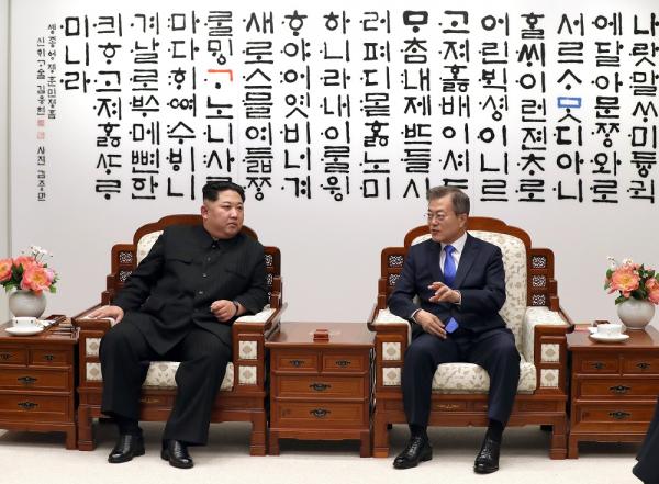 Οι δύο ηγέτες συζήτησαν την αποπυρηνικοποίηση της κορεατικής χερσονήσου, τη σύναψη ειρηνευτικής συμφωνίας και τη βελτίωση των διακορεατικών σχέσεων στη διάρκεια της πρώτης τους συνάντησης σήμερα, ανακοίνωσε ο Κυανός Οίκος
