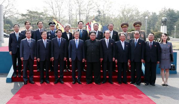 Ο Κιμ είναι ο πρώτος βορειοκορεάτης ηγέτης που επισκέπτεται τη Νότια Κορέα μετά το τέλος του πολέμου μεταξύ των δύο χωρών το 1953. Συνοδεύεται από την Κιμ Γιο Γιονγκ, αδελφή και έμπιστη σύμβουλό του, καθώς και το βορειοκορεάτη αξιωματούχο που είναι αρμόδιος για τις σχέσεις των δύο χωρών. Ο Μουν ήταν πλαισιωμένος από τον επικεφαλής της νοτιοκορεάτικης υπηρεσίας πληροφοριών και το διευθυντή της προεδρίας.