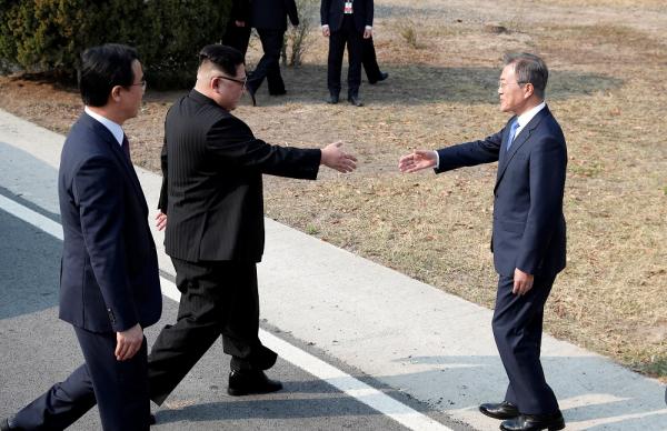 Με μια ιστορική χειραψία υψηλού συμβολισμού, πάνω στη στρατιωτική οροθετική γραμμή που χωρίζει στα δύο την κορεατική χερσόνησο, άρχισε η ιστορική Σύνοδος Κορυφής των ηγετών της Βόρειας Κορέας, Κιμ Γιονγκ Ουν, και της Νότιας Κορέας, Μουν Τζε-ιν.