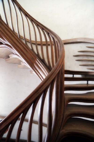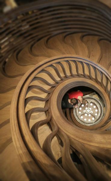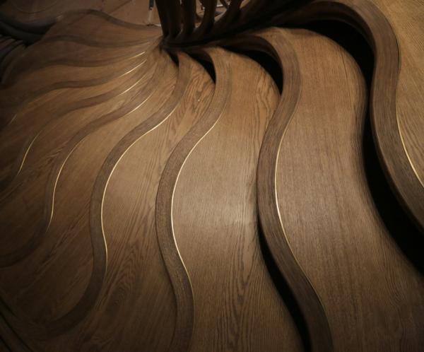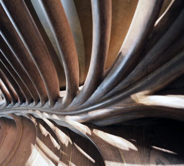 Τα σκαλοπάτια, οι λαβές, η βάση και ολόκληρη η κατασκευή της σκάλας ακολουθούν μια καμπυλωτή γεωμετρική ξύλινη δομή με λεπτομερή σκαλίσματα. Τα επίπεδα το σκαλοπατιών, αν τα κοιτάξει κανείς από την κορυφή της σκάλας, μοιάζουν με μονοπάτι στη μέση ενός αχανούς, αλλά πανέμορφου δάσους.