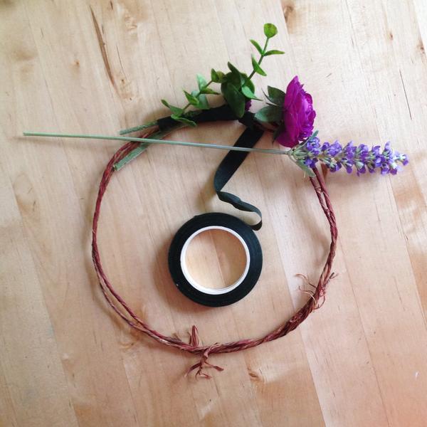 Ξεκινήστε να τυλίγεται γύρω από το σύρμα τα λουλούδια μεταξύ τους. Κολλήστε τις άκρες με ταινία ή με ένα σκοινάκι για να είναι σταθερό στη βάση. Κόψτε τις άκρες που προεξέχουν και έτοιμο!
