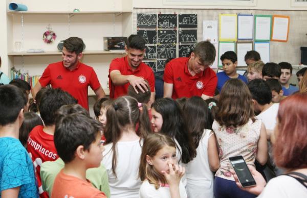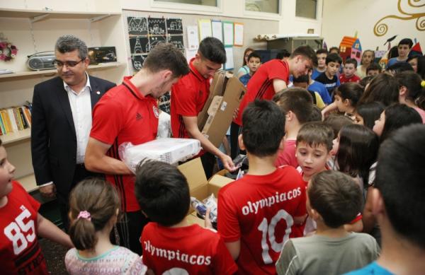 Η αντιπροσωπεία του της ομάδας του Πειραιά έγινε δεκτή με ενθουσιασμό στο 7ο Δημοτικό ενώ τα παιδιά μετά από την παράδοση του υλικού ζήτησαν και ποδοσφαιρικές συμβουλές από τους επαγγελματίες άσους του Ολυμπιακού.