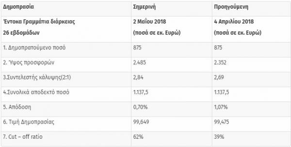 Η απόδοση διαμορφώθηκε στο 0,70%. Υποβλήθηκαν συνολικές προσφορές ύψους 2,485 δισεκατομμυρίων ευρώ, πού υπερκάλυψαν το ζητούμενο ποσό κατά 2,84 φορές.