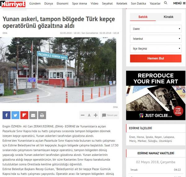 Τα τουρκικά ΜΜΕ μάλιστα, τα οποία ασχολούνται εκτενώς με την υπόθεση, δημοσιεύουν το όνομα και φωτογραφία του τούρκου συλληφθέντα, κάνοντας λόγο για παράνομη είσοδο στην Ελλάδα.