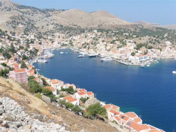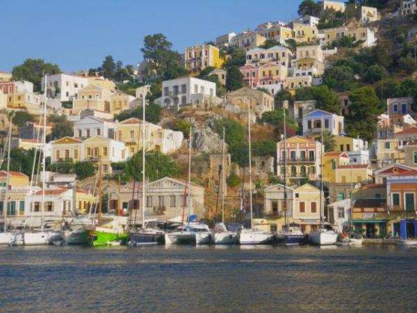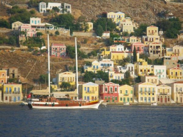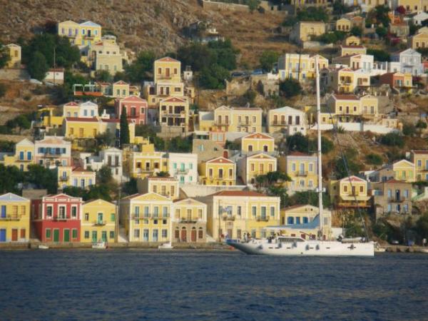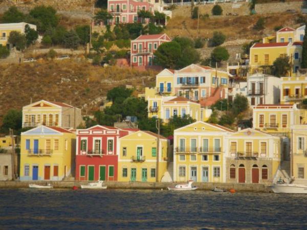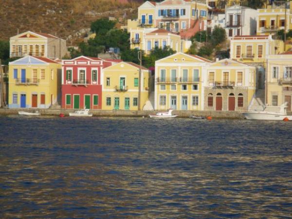 Στη σκούρα μπλε επιφάνεια του νερού του κλειστού κόλπου τρεμοπαίζουν τα σχήματα και τα χρώματα των αρχοντόσπιτων της Σύμης, που ορθώνονται αγέρωχα, μεγαλόπρεπα, περήφανα, τα ίδια ωραιότερα απ’ την αντανάκλασή τους.