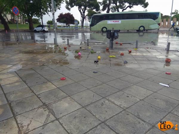 Η έντονη βροχή και τα «ποτάμια» που δημιουργήθηκαν στους δρόμους παρέσυραν ακόμη και γλάστρες από την Ανθοέκθεση, στο πλακόστρωτο της παραλίας, κάτω από τον Λευκό Πύργο.