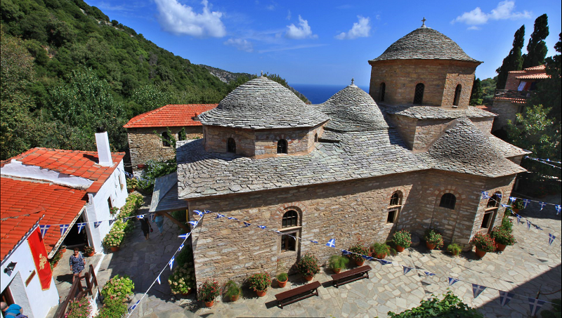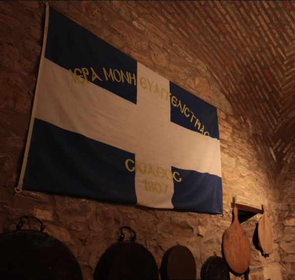 Τότε σχεδιάστηκε, υφάνθηκε, ευλογήθηκε και υψώθηκε στη μονή η πρώτη ελληνική σημαία με το λευκό σταυρό στη μέση πάνω σε γαλανό φόντο.