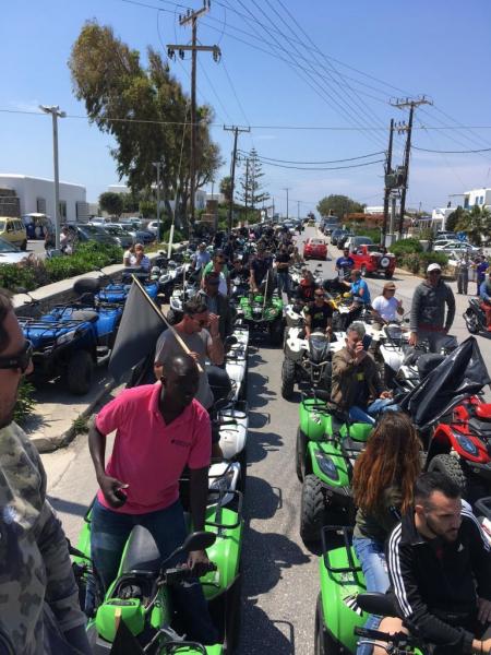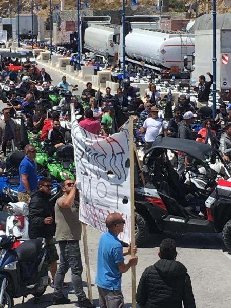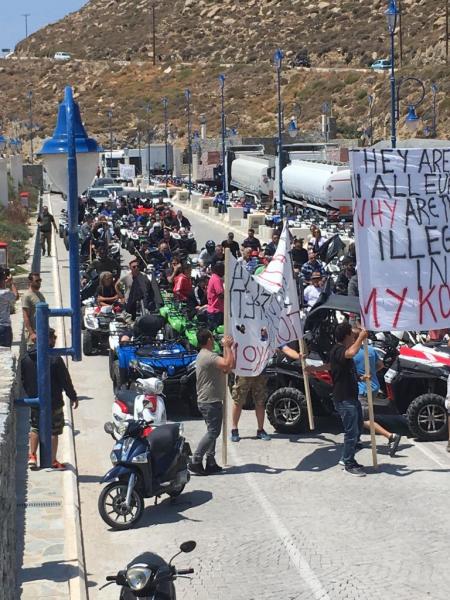 Κυκλοφοριακό «έμφραγμα» το μεσημέρι στη Μύκονο, σε λιμάνι και αεροδρόμιο όταν περισσότερα από 150 ATVs οδηγούμενα από ενοικιαστές και εργαζόμενους έκλεισαν για αρκετή ώρα την πόρτα του BLUE STAR, εμποδίζοντας την φορτοεκφόρτωση του πλοίου.