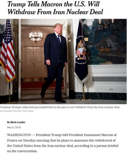 Ο αμερικανός πρόεδρος δήλωσε στον γάλλο ομόλογό του ότι οι ΗΠΑ θα αποχωρήσουν από τη διεθνή συμφωνία για το πυρηνικό πρόγραμμα του Ιράν, ανέφεραν οι New York Times, επικαλούμενοι ένα πρόσωπο ενήμερο με την τηλεφωνική επικοινωνία που είχαν νωρίτερα οι δύο ηγέτες.