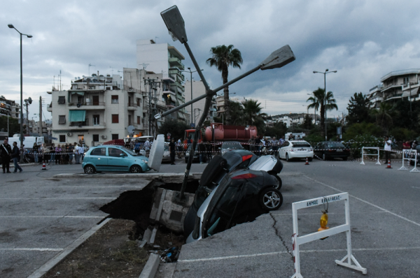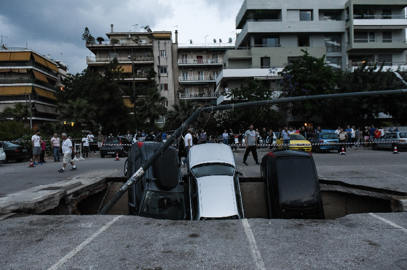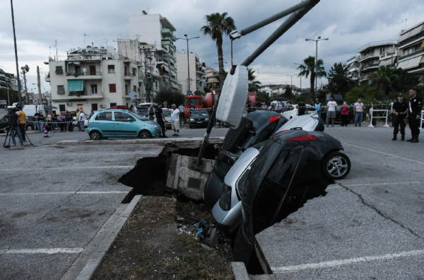 Μέσα στην μεγάλη τρύπα που άνοιξε στην άσφαλτο έπεσαν τρία σταθμευμένα αυτοκίνητα τα οποία έχουν υποστεί ζημιές.