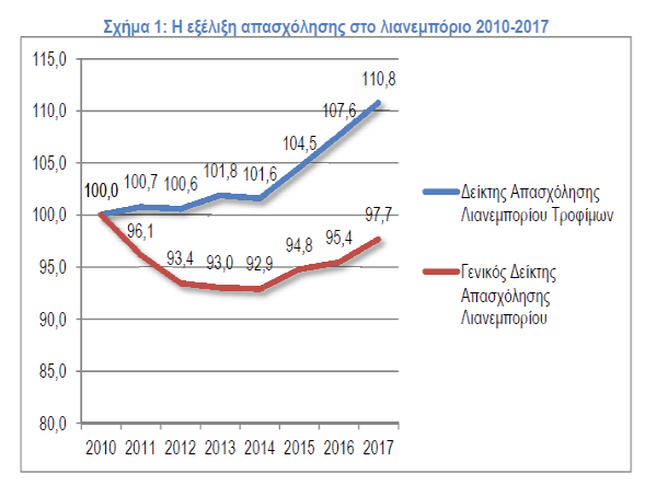 Συγκεκριμένα για το 2017 το λιανεμπόριο τροφίμων αύξησε την απασχόληση του 2,9% σε σχέση με το 2016, δηλαδή κατά 5,8 χιλ. εργαζομένους.
