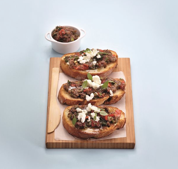 Μοιράζουμε τη γέμιση στις φρυγανισμένες φέτες του ψωμιού και προσθέτουμε τη φέτα και τον ψιλοκομμένο βασιλικό. Ραντίζουμε με λίγο ελαιόλαδο και σερβίρουμε.
