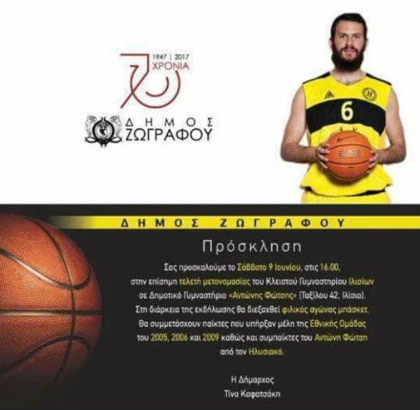 «Σας προσκαλούμε το Σάββατο 9 Ιουνίου, στις 16:00, στην επίσημη τελετή μετονομασίας του Κλειστού Γυμναστηρίου Ιλισίων σε Δημοτικό Γυμναστήριο «Αντώνης Φώτσης» (Ταξίλου 42, Ιλίσια). Στη διάρκεια της εκδήλωσης θα διεξαχθεί φιλικός αγώνας μπάσκετ. Θα συμμετάσχουν παίκτες που υπήρξαν μέλη της Εθνικής Ομάδας του 2005, 2006 και 2009, καθώς και συμπαίκτες του Αντώνη Φώτση από τον Ηλυσιακό.