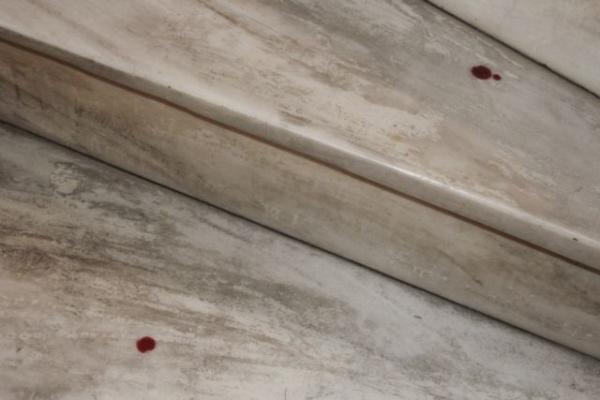 Στη διάρκεια της καταδρομικής επίθεσης ο 19χρονος τραυματίστηκε στο χέρι, όπως αποδεικνύουν και οι κηλίδες αίματος που βρέθηκαν στα σκαλιά της πολυκατοικίας που βρίσκεται το συμβολαιογραφείο (φωτογραφία αριστερά) και λίγα μόλις λεπτά αργότερα εντοπίστηκε να αιμορραγεί από αστυνομικούς της Κρατικής Ασφάλειας.