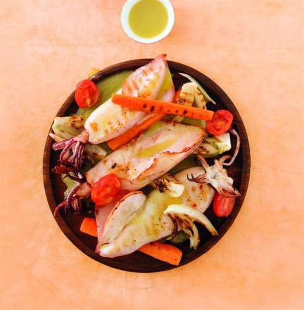 Καλαμάρια με ψητά λαχανικά στη σχάρα
