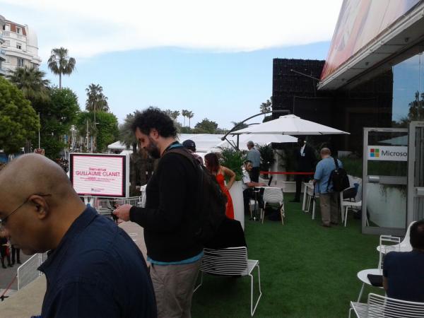 Aποψη του μπαλκονιού της αίθουσας Τύπου του Palais De Festival όπου κάποιοι γράφουν στα laptop τους, κάποιοι κάνουν ένα διάλειμμα για να συνεχίσουν μέσα και κάποιοι απλώς ξεκουράζονται σκοτώνοντας την ώρα τους. Δίπλα ακριβώς, βρίσκεται η αίθουσα Lumiere με το κόκκινο χαλί και η κόκκινη κορδέλα σημαίνει ότι δεν μπορείς να την περάσεις για να φωτογραφήσεις.