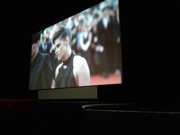 Η Κίρστεν Στιούαρτ ενώ μπαίνει στην αίθουσα Λιμιέρ για την τελευτή έναρξης του φεστιβάλ. Η φωτογραφία είναι τραβηγμένη μέσα στην διπλανή αίθουσα Claude Debussy όπου η τελετή μεταδιδόταν ζωντανά για τους δημοσιογράφους.
